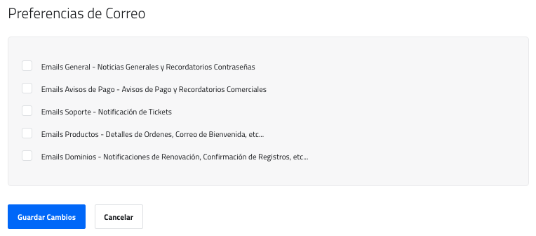 3. En la parte inferior se deben seleccionar las Preferencias de Correo correspondientes para que el usuario pueda generar y dar seguimiento a Tickets, recibir notificaciones, avisos de pago, entre otros: