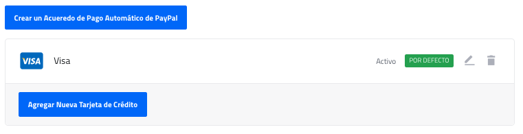 para editar la información ya registrada o bien, dar clic en Agregar Nueva Tarjeta de Crédito o Crear un Acuerdo de Pago Automático de PayPal.
