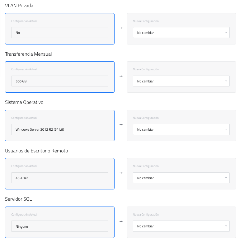 - Para modificar los recursos del Cloud Server, después de ingresar con usuario y contraseña a Mi Cuenta->Mis Servicios->Cloud Server->Administrar, se debe dar clic en 'Cambiar Opciones' en la sección 'Acciones' del lado izquierdo de la pantalla: