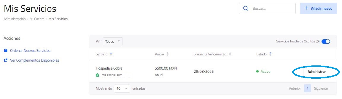 1. Al ingresar con usuario y contraseña a Mi Cuenta, en la sección Mis Servicios, dar clic sobre Administrar: