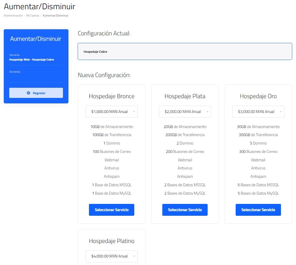 4. Dar clic en 'Seleccionar Servicio' del plan que se desea para la nueva configuración. Se generará la Orden y el Aviso de Pago correspondientes.