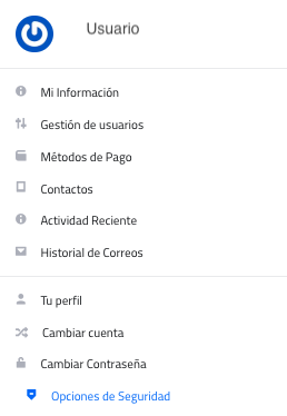 1. Ingresar con usuario y contraseña a Mi Cuenta. En la esquina superior derecha de la pantalla, dar clic sobre el Usuario/Cuenta para obtener el siguiente menú: