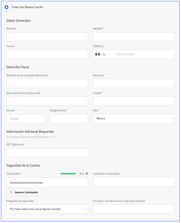Para los usuarios sin registro previo, se les pedirá registrarse al procesar una Orden en el Carrito de Pedidos. Únicamente deberá proporcionar los datos requeridos en el formulario: