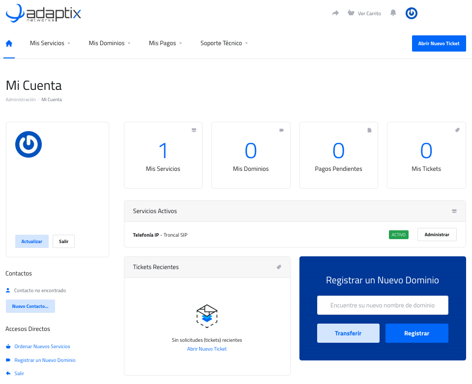Mi Cuenta permite al usuario administrar los servicios contratados en Adaptix Networks, también le permitirá agregar nuevos servicios.