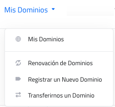 En Mis Dominios, se desplegará un submenú con las opciones Mis Dominios, Renovación de Dominios, Registrar un Nuevo Dominio y Transferirnos un Dominio: