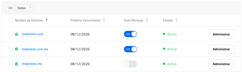 En Mis Dominios se presentará información de la siguiente forma: