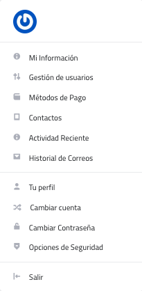 Por último, del lado derecho superior de la pantalla, al dar clic sobre la Cuenta/Usuario se obtiene el siguiente submenú:
