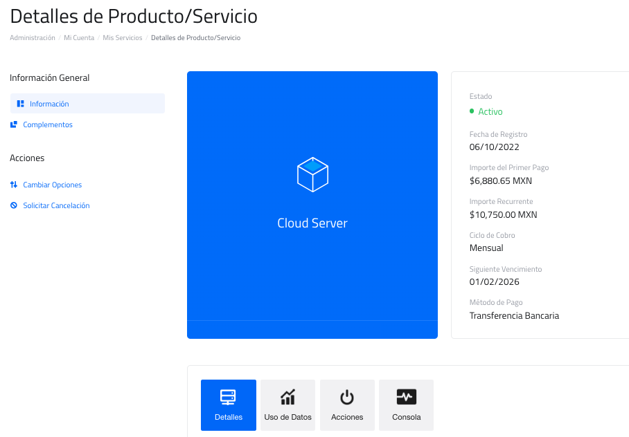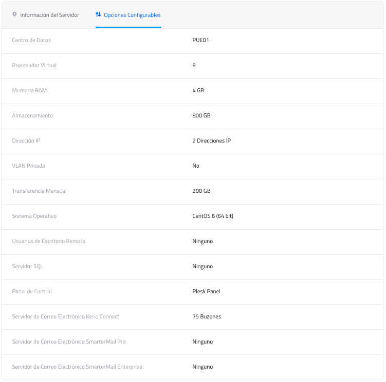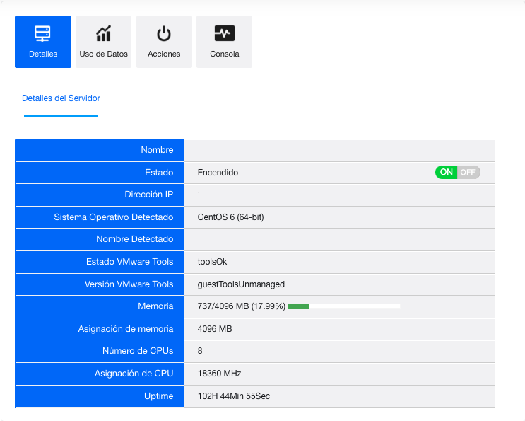 Debajo de la sección Detalles, Uso de Datos, Acciones y Consola, se encuentran las pestañas Información de Servidor y Opciones Configurables: