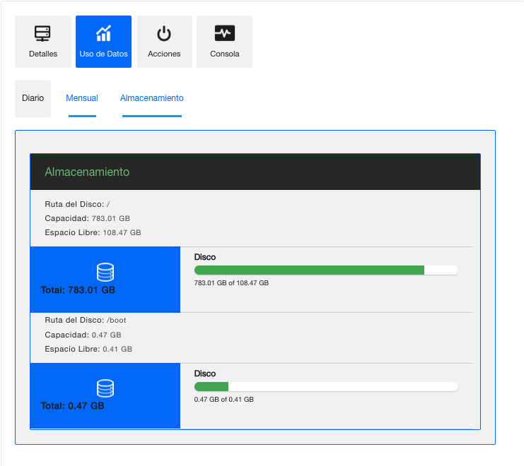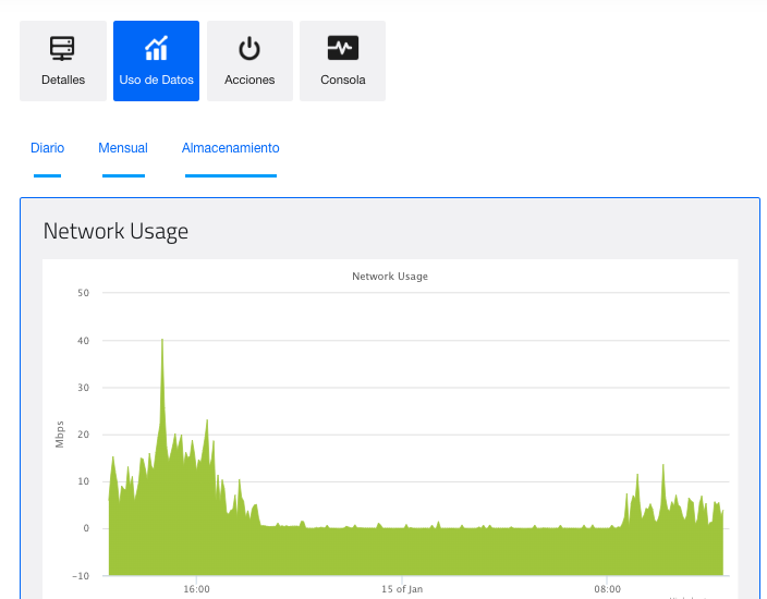 - En Uso de Datos, se puede ver el uso de la red, CPU y memoria de manera diaria o mensual: