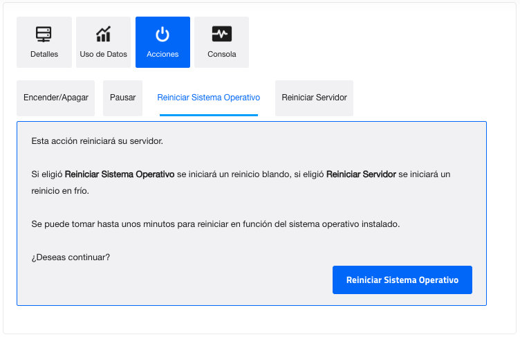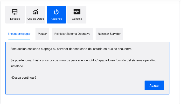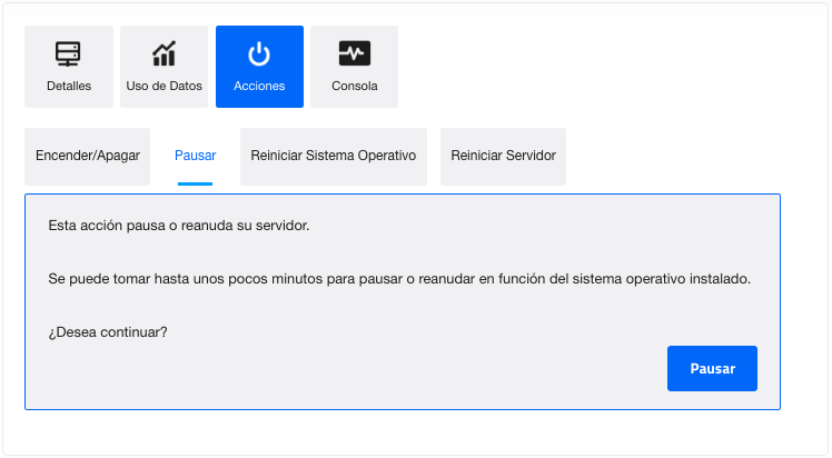 - En Acciones se puede Encender/Apagar, Pausar, Reiniciar SO y Reiniciar Servidor: