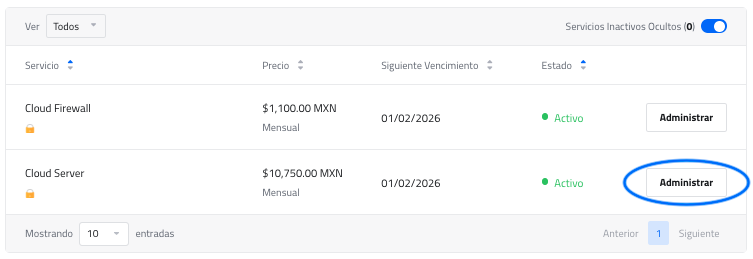 3. Al dar clic en el botón 'Administrar' obtendrá lo siguiente: