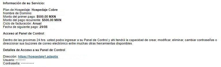 Al dar de alta el servicio de Hospedaje Compartido, se envía un mensaje a la cuenta de registro con la información correspondiente: