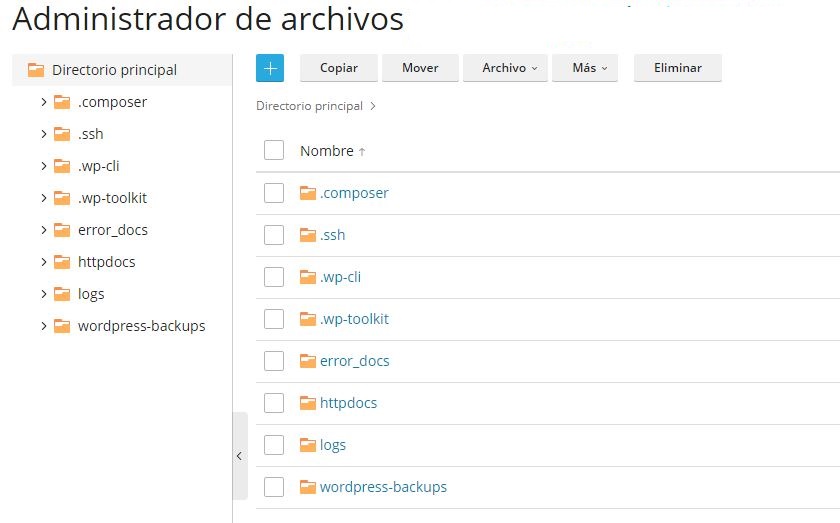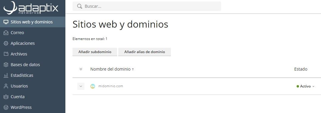 Del lado izquierdo de la pantalla se encuentran las opciones: Sitios web y dominios, Correo, Aplicaciones, Archivos, Bases de datos, Estadísticas, Usuarios, Cuenta y WordPress.