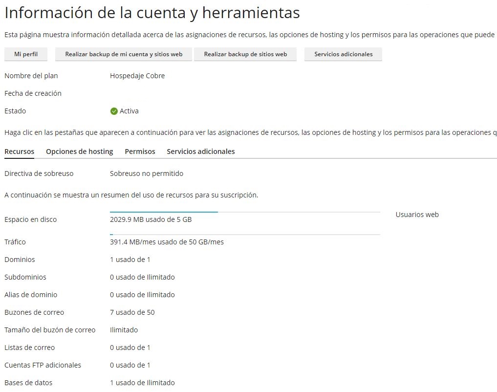 -En Sitios web y dominios, se incluyen las opciones de configuración del Hospedaje Compartido.